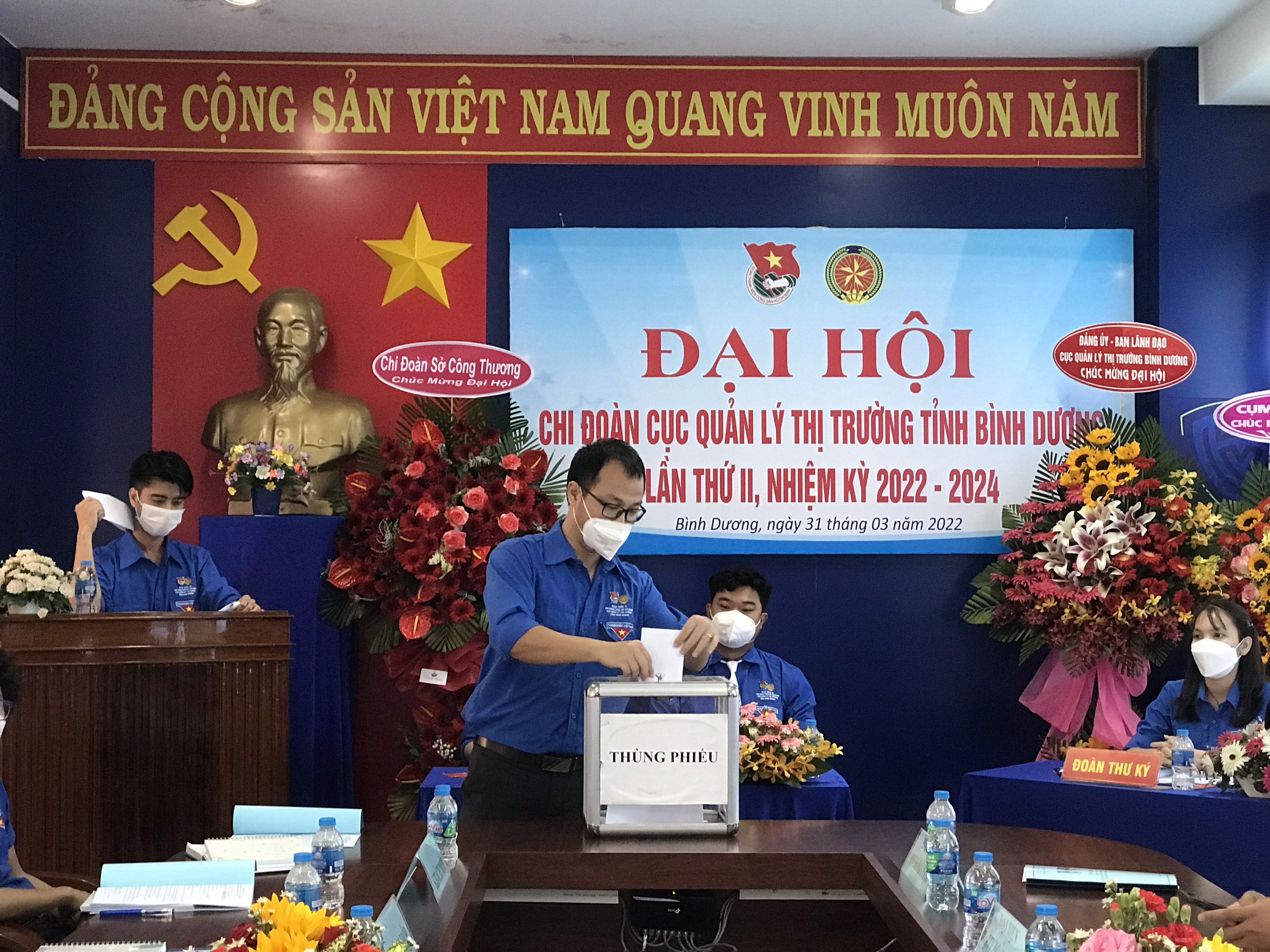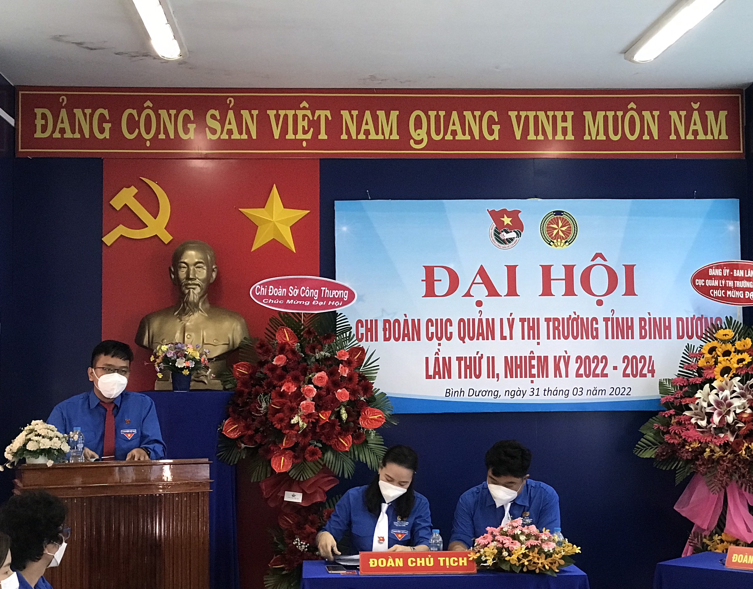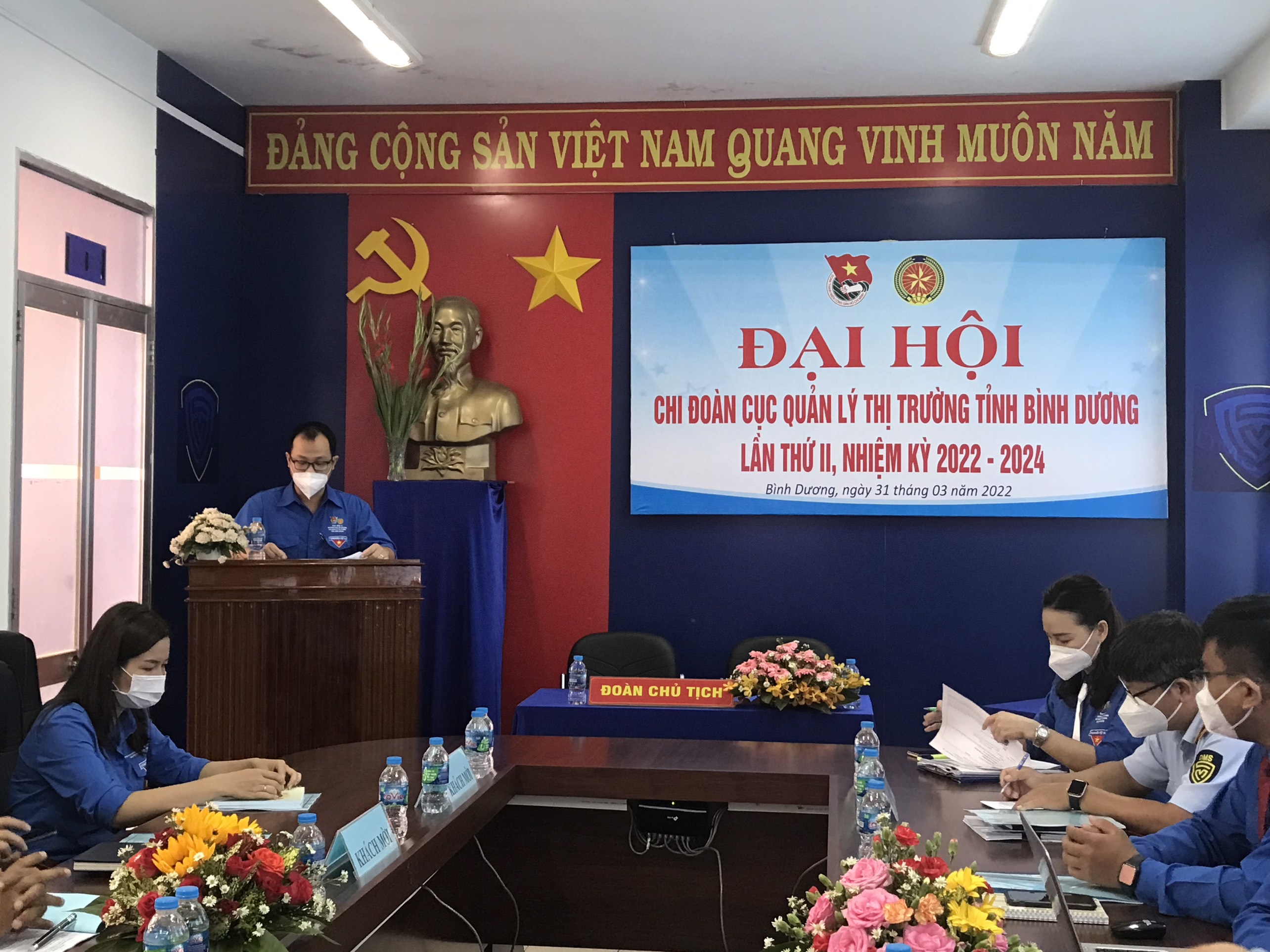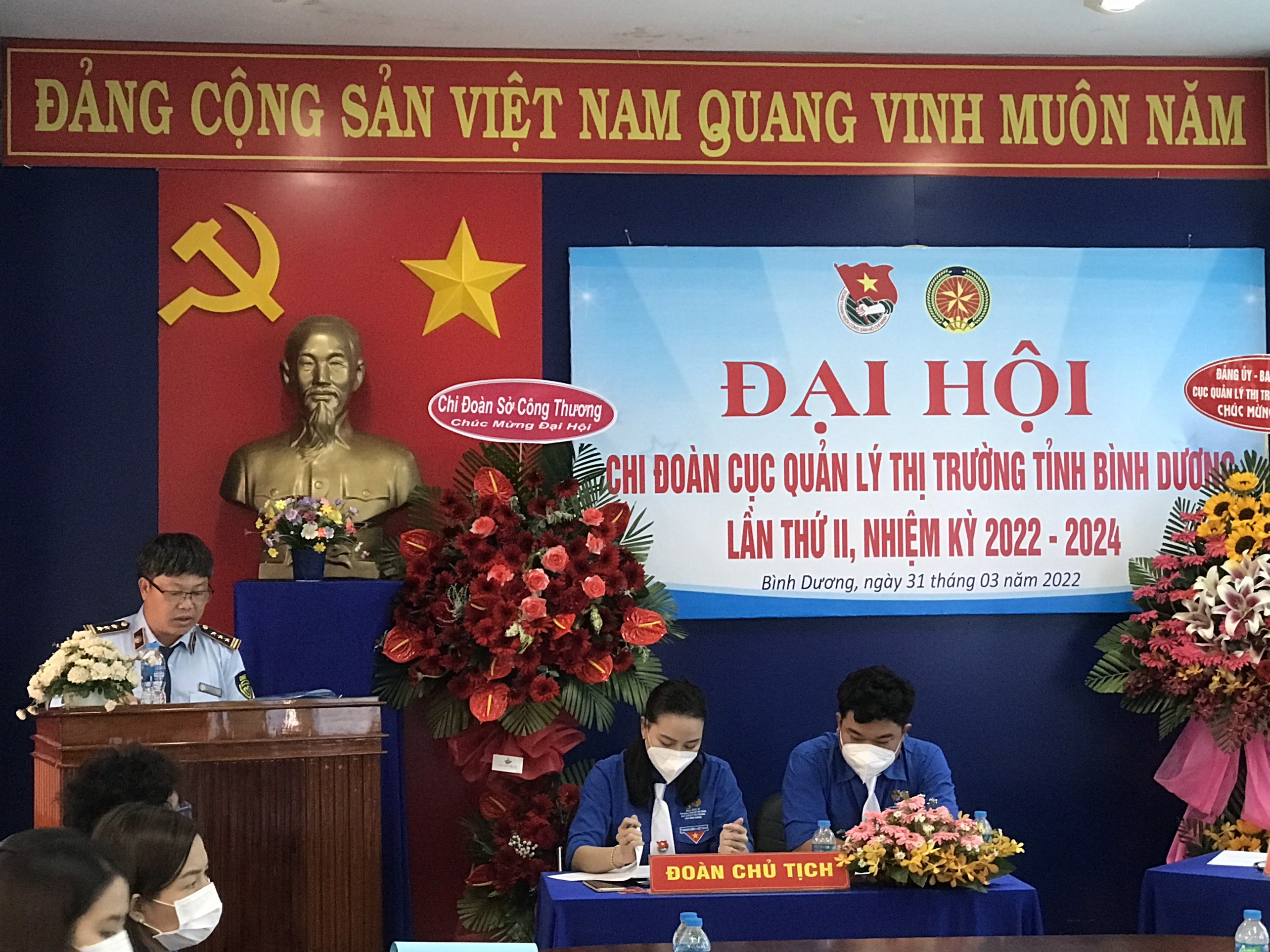 Sáng ngày 31/3/2022, tại Hội trường B – Cục Quản lý thị trường tỉnh Bình Dương, Chi đoàn Cục Quản lý thị trường tỉnh Bình Dương tổ chức Đại hội Chi đoàn lần II, nhiệm kỳ 2022-2024. Tham dự Đại hội có: Đồng chí Trần Văn Tuấn, Phó Bí thư Đảng ủy Cục Quản lý thị trường tỉnh Bình Dương, Phó Cục trưởng; đồng chí Biện Tuấn Vũ, Phó Bí thư Đoàn khối các Cơ quan và Doanh nghiệp tỉnh; Các đồng chí là đại diện Ban Chấp hành của các cơ sở Đoàn bạn trong Khối và cùng 10 đại biểu đoàn viên của Chi đoàn cùng tham dự.