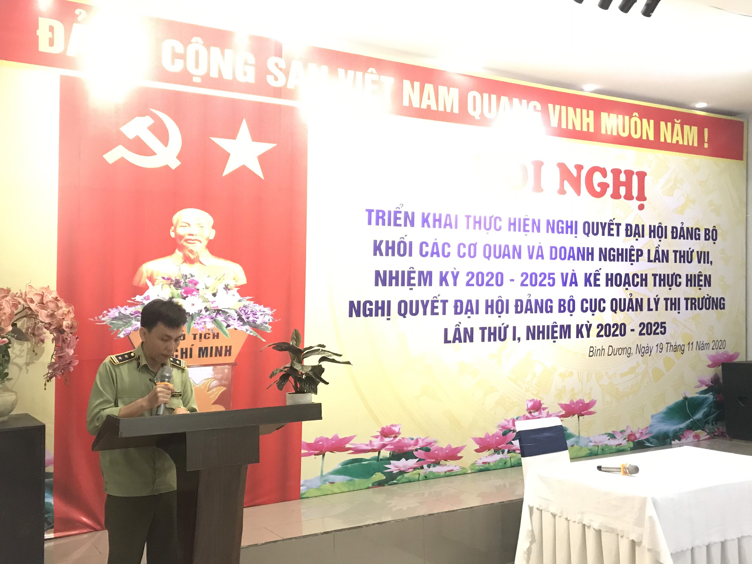 Tại Hội nghị, đồng chí Nguyễn Phương Đông – Bí thư Đảng ủy Cục QLTT tỉnh Bình Dương đã phổ biến, quán triệt Nghị quyết Đại hội Đảng bộ khối các Cơ quan và Doanh nghiệp Tỉnh lần thứ VII, nhiệm kỳ 2020 – 2025 và Kế hoạch triển khai Chương trình hành động thực hiện Nghị quyết của Đại hội Đảng bộ Cục Quản lý thị trường lần thứ I, nhiệm kỳ 2020 – 2025.