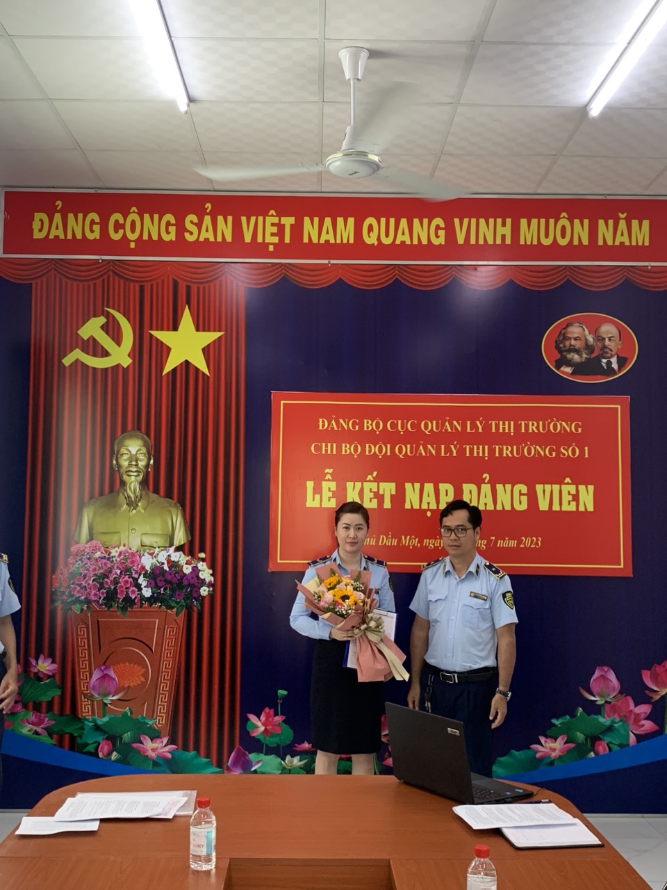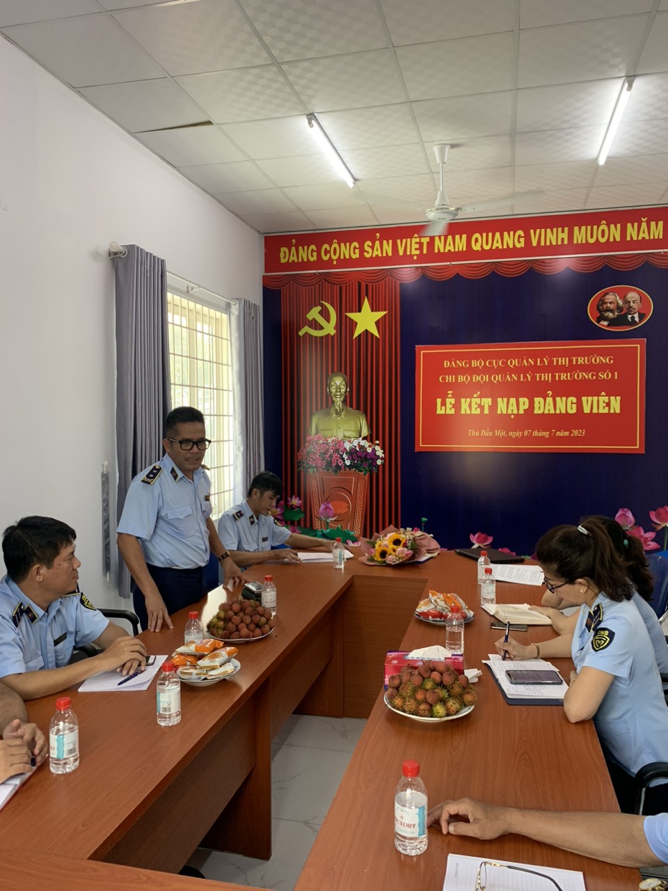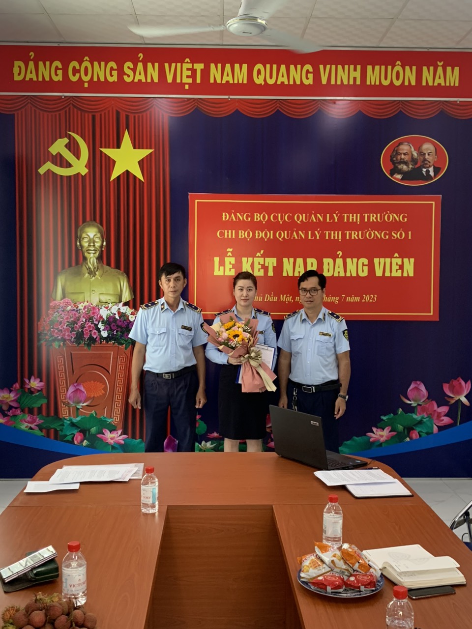 Được sự đồng ý của Đảng uỷ Cục Quản lý thị trường tỉnh Bình Dương, sáng ngày 07/07/2023, tại Trụ sở Đội Quản lý thị trường số 1 thành phố Thủ Dầu Một, Chi bộ Đội Quản lý thị trường số 1 trân trọng tổ chức Lễ kết nạp đảng viên mới. Tham dự Lễ kết nạp có đồng chí Nguyễn Hữu Nghĩa - Uỷ viên BTV Đảng uỷ Cục Quản lý thị trường tỉnh Bình Dương cùng các đồng chí trong Chi uỷ và toàn thể Đảng viên Chi bộ Đội Quản lý thị trường số 1.
