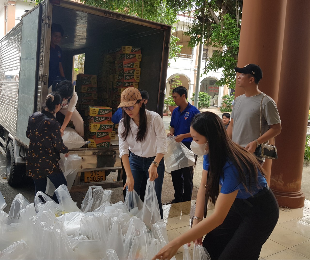Hình ảnh trao 100 phần quà gồm gạo, đường, hạt nêm, mì gói,,... cho người dân