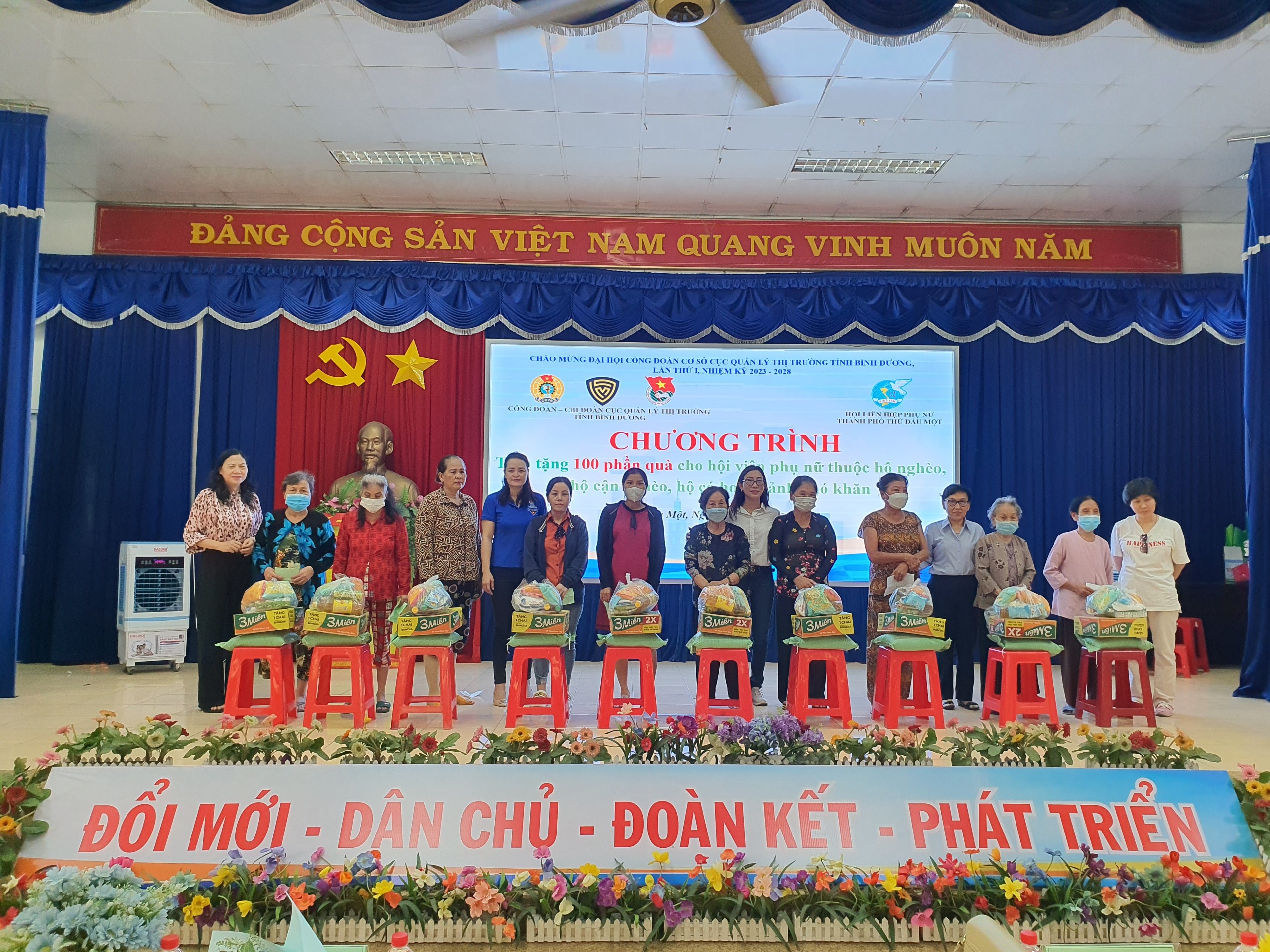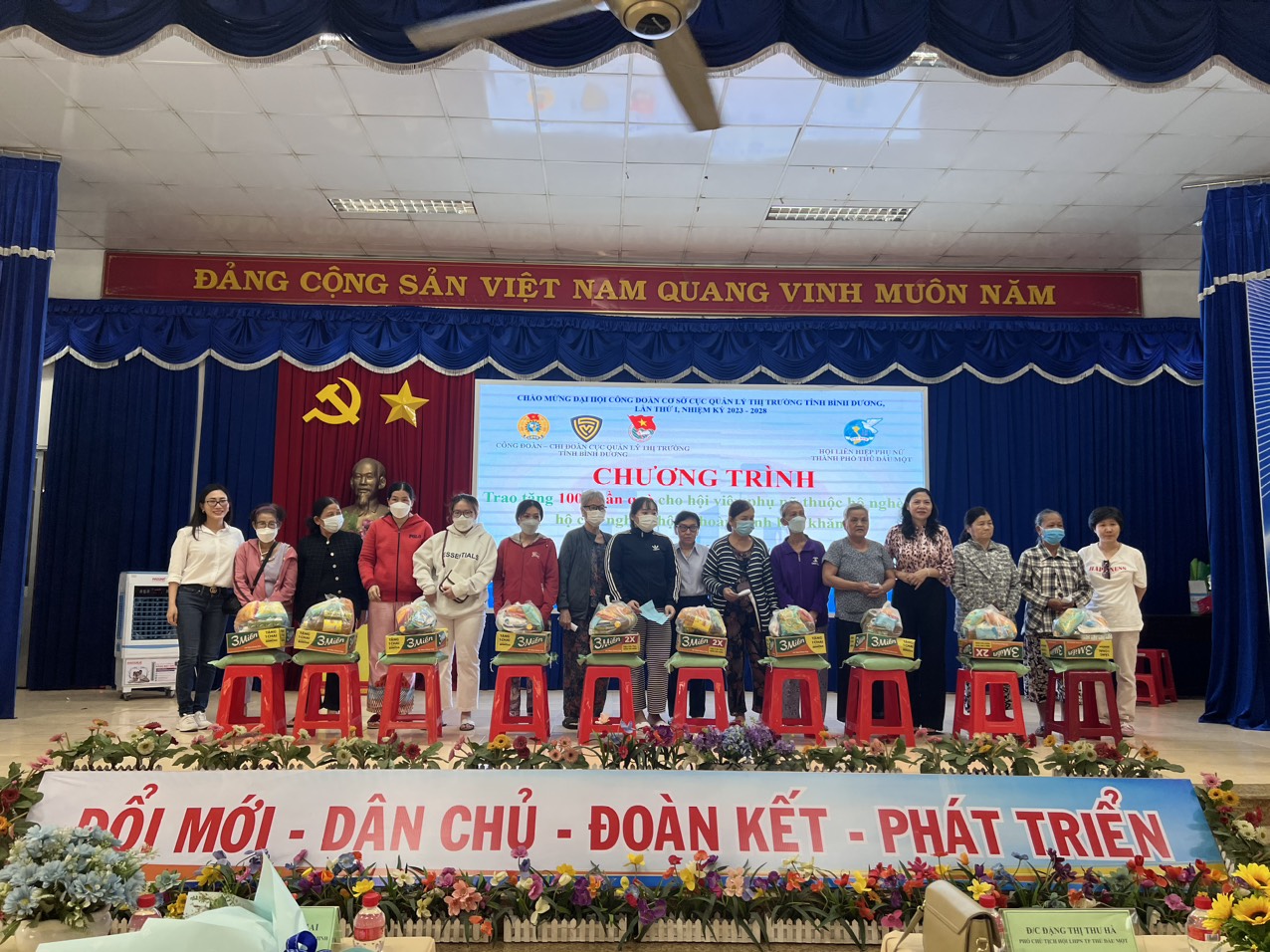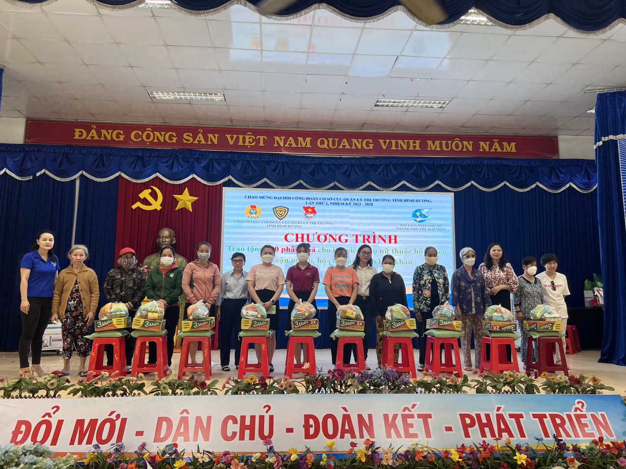 Sáng ngày 15/4/2023 tại Hội trường UBND phường Phú Lợi, Công đoàn cơ sở đã phối hợp Chi đoàn Cục Quản lý thị trường tỉnh Bình Dương và Hội liên hiệp phụ nữ thành phố Thủ Dầu Một tổ chức trao tặng 100 phần quà hỗ trợ cho hội viên, phụ nữ thuộc hộ nghèo, hộ cận nghèo, có hoàn cảnh khó khăn (mỗi phần quà trị giá 300.000 đồng, gồm gạo, đường, hạt nêm, mì gói, sữa, bánh kẹo,...) trên địa bàn thành phố Thủ Dầu Một. Nguồn kinh phí được vận động từ các mạnh thường quân.