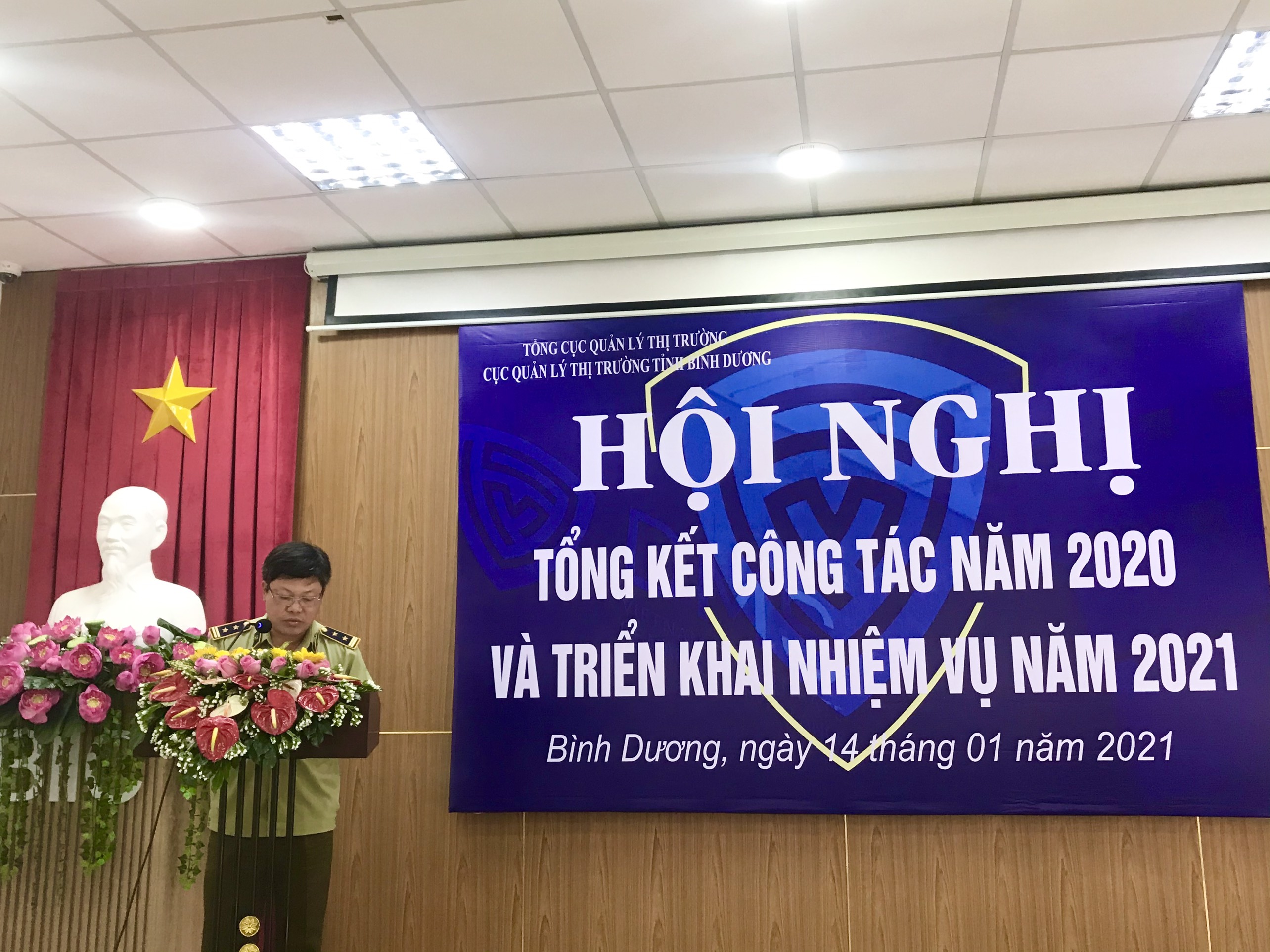 Tại Hội nghị đồng chí Trần Văn Tuấn - Phó Cục trưởng đã trình bày tóm tắt báo cáo kết quả công tác, những khó khăn, vướng mắc, kiến nghị đề xuất trong quá trình triển khai thực hiện nhiệm vụ trong năm 2020 và nhiệm vụ cần tập trung thực hiện trong năm 2021 của Cục QLTT tỉnh Bình Dương.