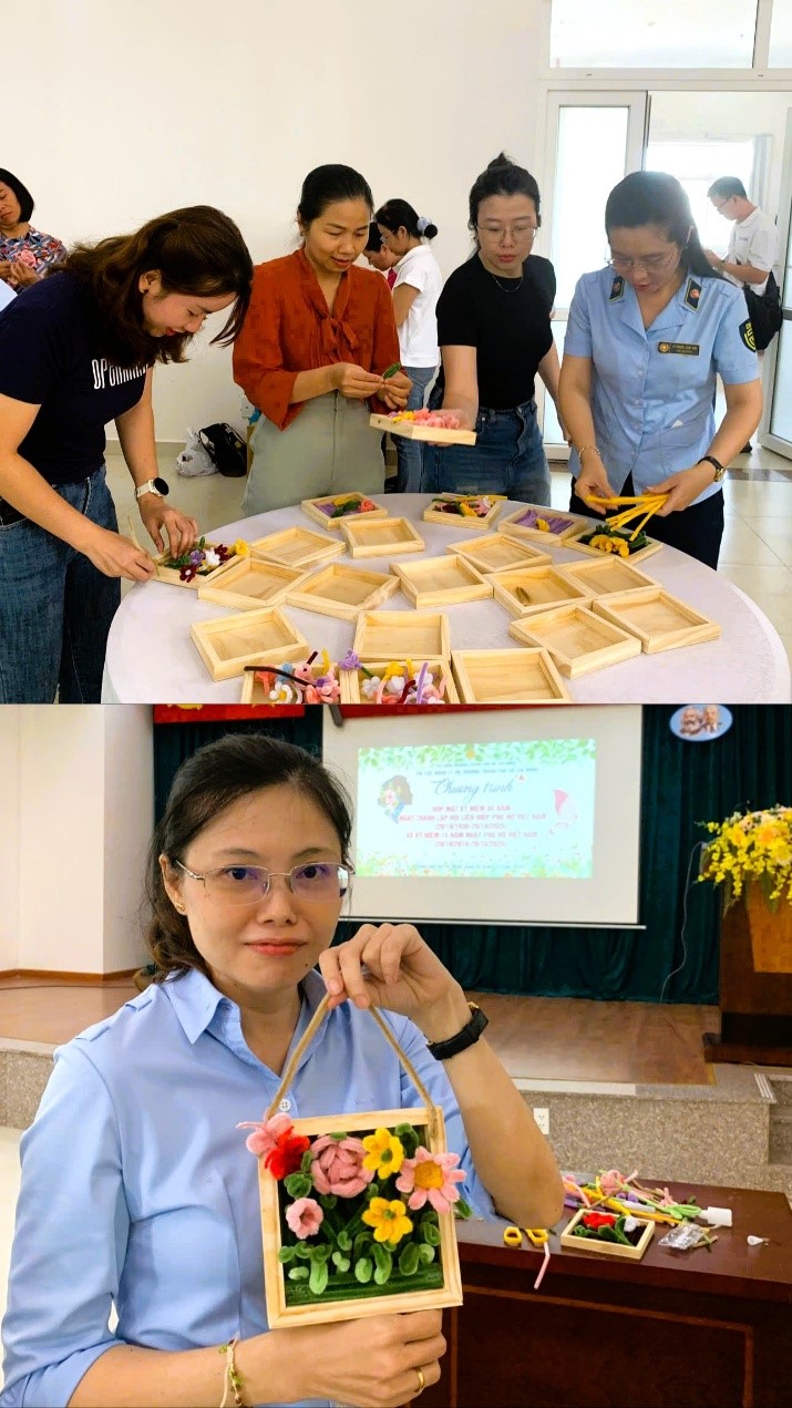 Đặc biệt, phần hoạt động trải nghiệm làm tranh kẽm nhung được tổ chức trước đó đã thu hút đông đảo chị em tham gia. Đây là hoạt động sáng tạo, giúp thư giãn sau giờ làm việc, đồng thời thể hiện sự khéo léo, tinh tế, những phẩm chất truyền thống đáng quý của phụ nữ Việt Nam.